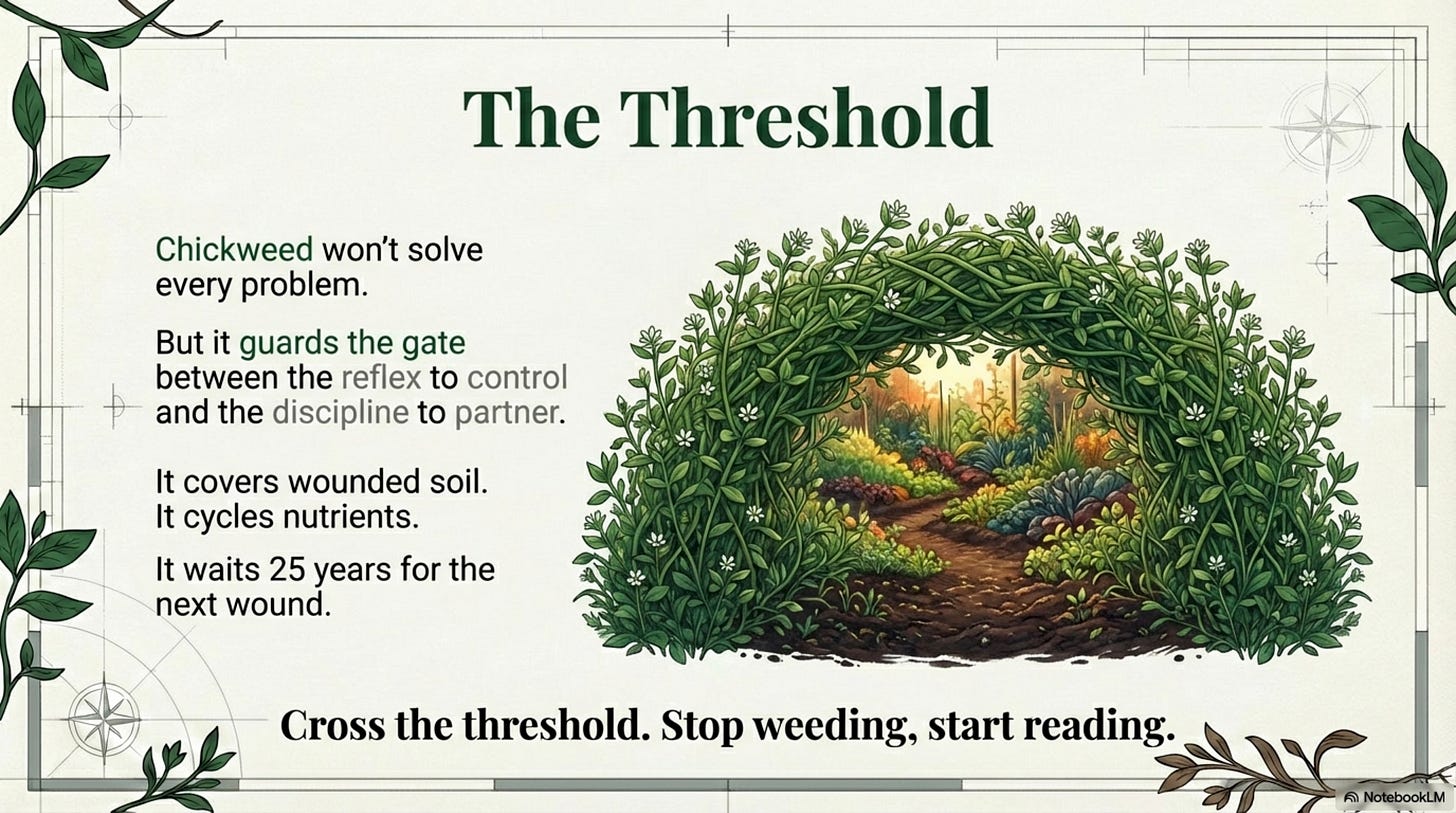 Then I braided those perspectives together so you’re not left with random fun facts, but something you can use: a way to read chickweed as indicator, helper, tradeoff, or boundary, depending on where it’s growing and what you’re trying to grow.